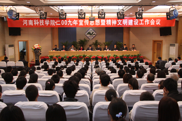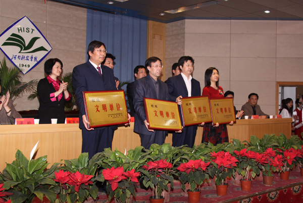 会议在雄壮的国歌、校歌声中开始。副校长梁赖宣读《中共河南科技学院关于命名和表彰2008年度校级文明单位、文明班级、文明教师、文明学生的决定》,在欢快的乐曲声中,校领导为文明单位、文明教师、文明班级代表、文明学生代表颁奖。