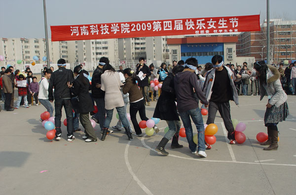 其中,3月7日,人文学院团委举办的“快乐女生节”联欢活动上演了“穿越障碍”、 “成语接龙” 、春晚经典语录“我骄傲”的河南方言版游戏等一系列幽默搞笑、突出人文特色的节目。数学系团委开展 了以“活力女生”为主题的跳绳、踢毽子、踩气球、瞎子背瘸子等妙趣横生的活动,活跃了女生们的校园生活。