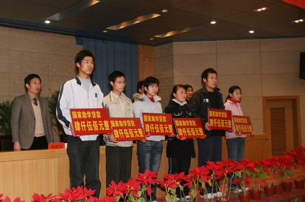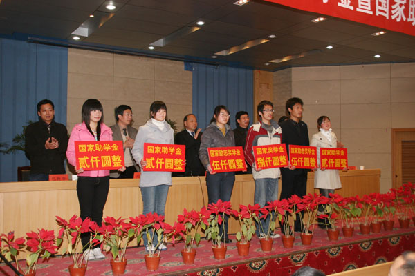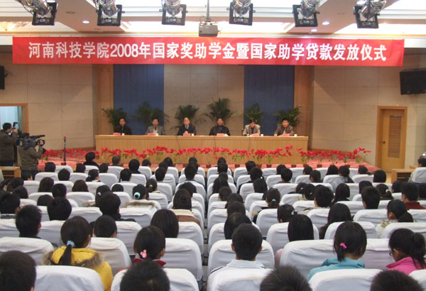 发放仪式在激越的校歌声中开幕。校党委副书记郭海波宣读了获得2008年度国家奖助学金和国家助学贷款学生名单。随后,校领导为12名学生代表一一发放了2008年度国家奖助学金和助学贷款。人文学院赵麟同学、经济与管理学院于雪红同学代表全体受助学生作了发言,表达了将自觉遵守贷款协议,按期偿还贷款本息,诚实守信,勤奋学习,以优异的成绩报答国家、报答社会、报答学校的心声。参加会议的全体受助学生还进行了庄严的诚信宣誓。