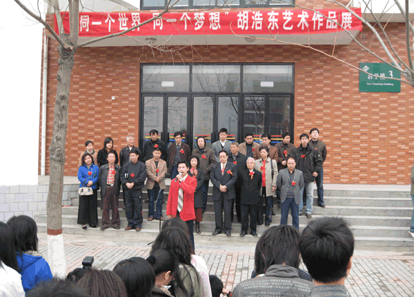 3月29日上午,由校团委主办、艺术学院团委承办的“同一个世界,同一个梦想”胡浩东艺术作品展开幕式在3号教学楼前举行,艺术学院党总支书记谢桂英、新乡电影公司总经理鲁广金、河南省书协会员耿喜顺等16位知名人士及胡浩东的指导老师和同学参加了作品展开幕式。