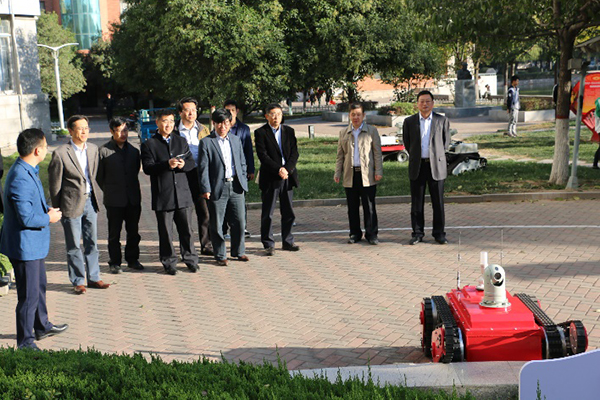 与会专家观看我校自主研发的特种机器人
