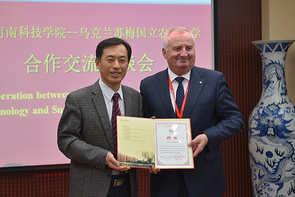 随后,李成伟为拉迪卡院士颁发了“中乌河南科技学院-苏梅国立农业大学国际联合研究生院”名誉院长的聘书。