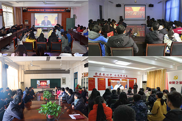 各层党委、党总支组织广大师生分别在行政楼会议室、各单位会议室、活动室、教研室,学生公寓及餐厅内收听收看了大会盛况。收听收看了之后,全校干部师生一致认为,经过改革开放40年的开拓前进,中华民族迎来了从站起来、富起来到强起来的伟大飞跃,迎来了实现中华民族伟大复兴的光明前景。“神舟”飞天、“蛟龙”入海、“天眼”探空等使大家感受到了国家的发展力量,恢复高考、科教兴国、高铁、生态文明建设、“大众创业、万众创新”等使大家充分感受到了改革开放带来实实在在的获得感幸福感。习近平总书记的讲话,吹响了锐意进取的新时代改革开放的号角,催人奋进,令人振奋。大家纷纷表示一定要全面贯彻落实党的十九大精神,大力培育和弘扬团结奋进、拼搏创新、苦干实干、后发赶超的精神,以蓬勃的朝气标注新时代的奋斗气质,点燃新征程的奋斗激情,努力干好本职工作,为学校和教育的发展增添新动力。
