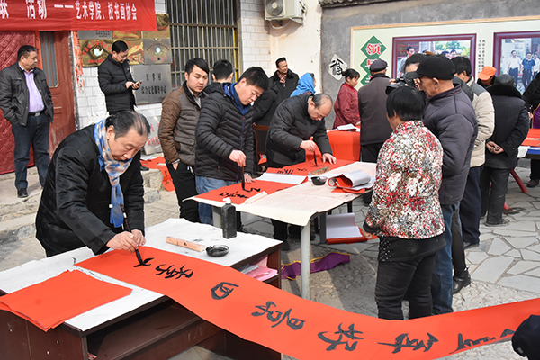 此外,我校还奔赴淇县东掌村等地开展了义写春联活动。该项活动已经连续进行17年,安阳、鹤壁、新乡等数十个村庄、社区里都留下了他们默默奉献的足迹,受到了当地群众的交口称赞,也受到新乡日报、新乡电视台等多家媒体的采访报道,有效提升了我校的美誉度。