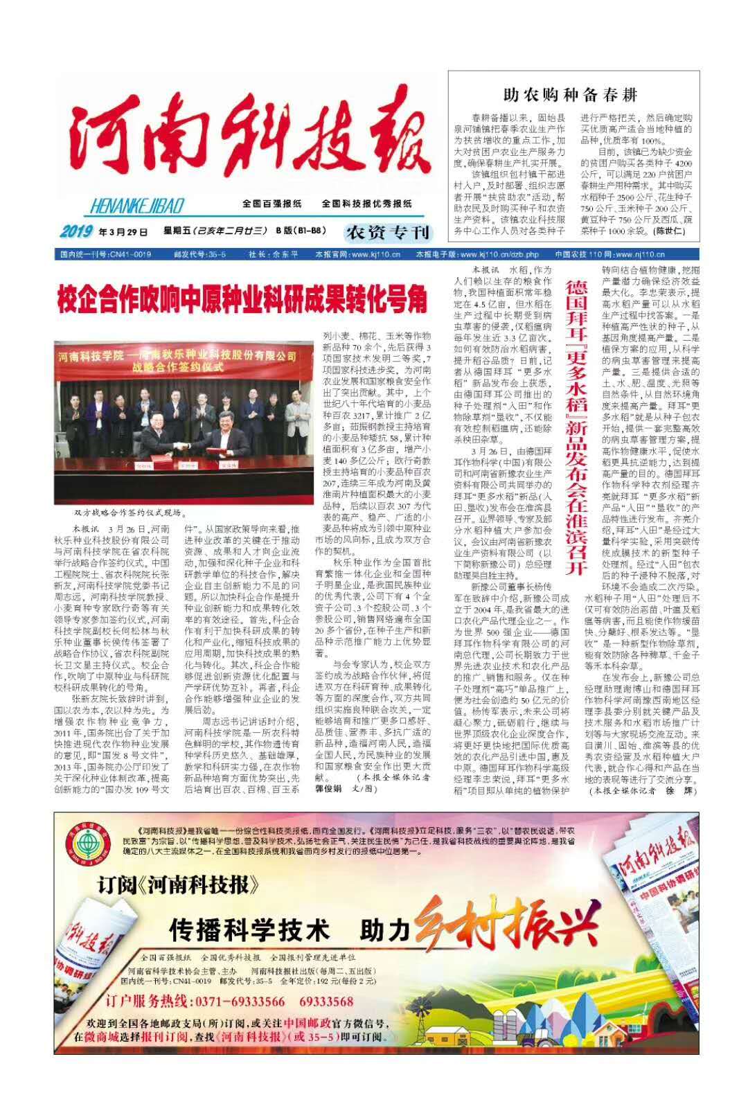 3月26日下午,我校与河南秋乐种业科技股份有限公司战略合作协议签约仪式在河南省农科院举行。3月29日,《河南科技报》对此进行了报道。