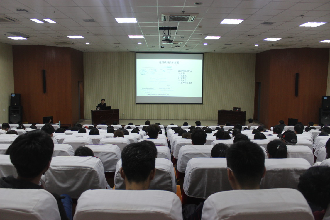 在图书馆一楼报告厅,左二伟为学生代表做了一场“基因编辑技术研究进展”学术报告。他从大学生活、学习提升、工作感悟等几方面分享了自己的学习工作经历,勉励学弟学妹们不断加强学习,做一个与时代同行的努力奋斗人,主动创造机会,赢得胜利。