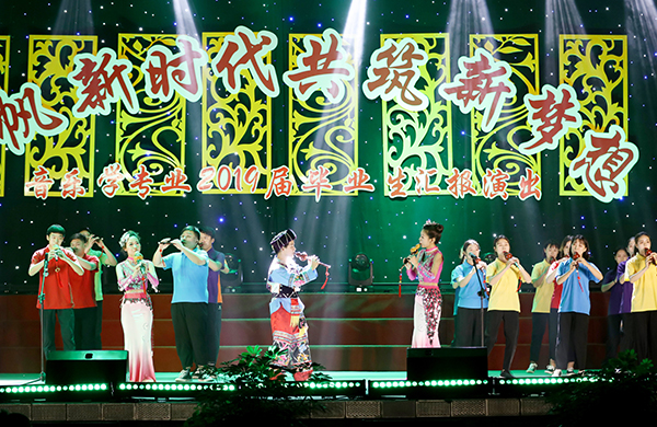 演出在歌伴舞《祖国之恋》中拉开帷幕。器乐合奏《竹林深处》、戏曲《梨花颂》、特别设计《永恒的师生情》、武术表演《少年中国说》等14个风格不同的节目,或舒缓婉转、或激昂奋进、或铿锵有力、或欢快悦耳,充分展示了艺术学院音乐学专业2019届毕业生的专业能力和素养,为现场观众带来了一场丰盛的视听盛宴,赢得了大家的热烈掌声。