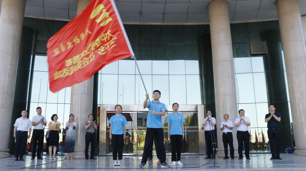 杨松璋为“三下乡”社会实践团队实践团队授旗,380多支实践团队、12000多名实践队员奔赴全省全国实践基层开展社会实践活动。