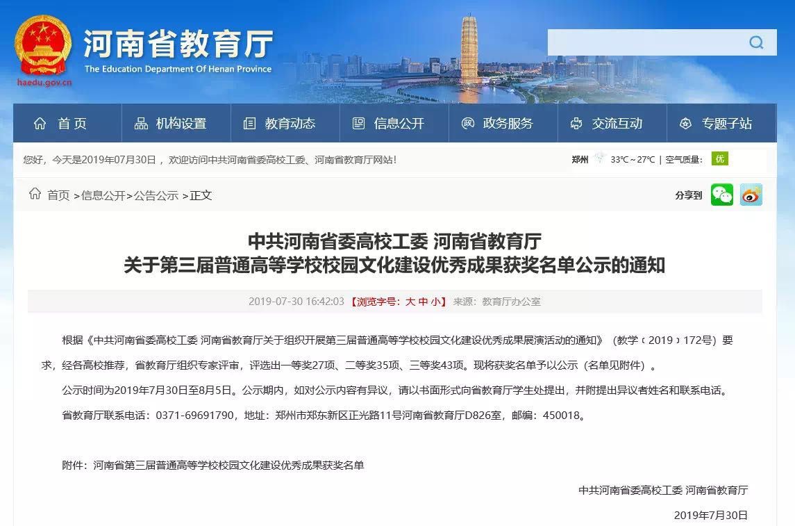 近日,省委高校工委、省教育厅对第三届河南高校校园文化建设优秀成果获奖名单进行了公示,我校2项成果获奖。