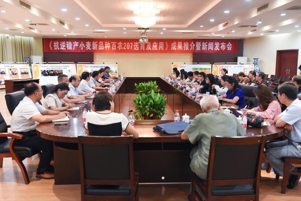 8月16日上午,我校在行政楼206会议室举行《抗逆稳产小麦新品种百农207选育及应用》成果推介及新闻发布会。校长李成伟,农业部专家指导组副组长郭天财,国家小麦品种审定委员会主任、河南省种子管理站副站长周继泽出席会议,新乡市科技局和周口市、新乡市、商丘市等地种子管理站负责人,百农207主推企业代表和种植大户代表,以及我校党委宣传部、科技处、生命科技学院等单位负责人参加了会议。会议还邀请了中国科技新闻学会组织,光明网、人民网、经济日报、中国科学报、农民日报、中国财经报、工人日报、新浪网等多家主流媒体组成的采访团。会议由党委宣传部部长陈红卫主持。