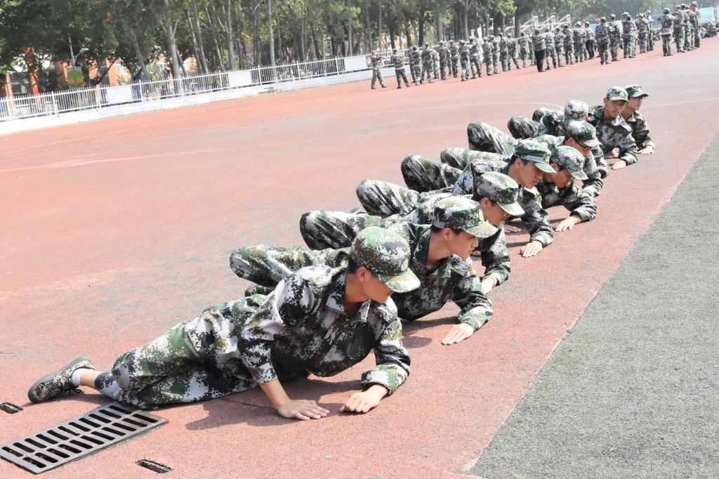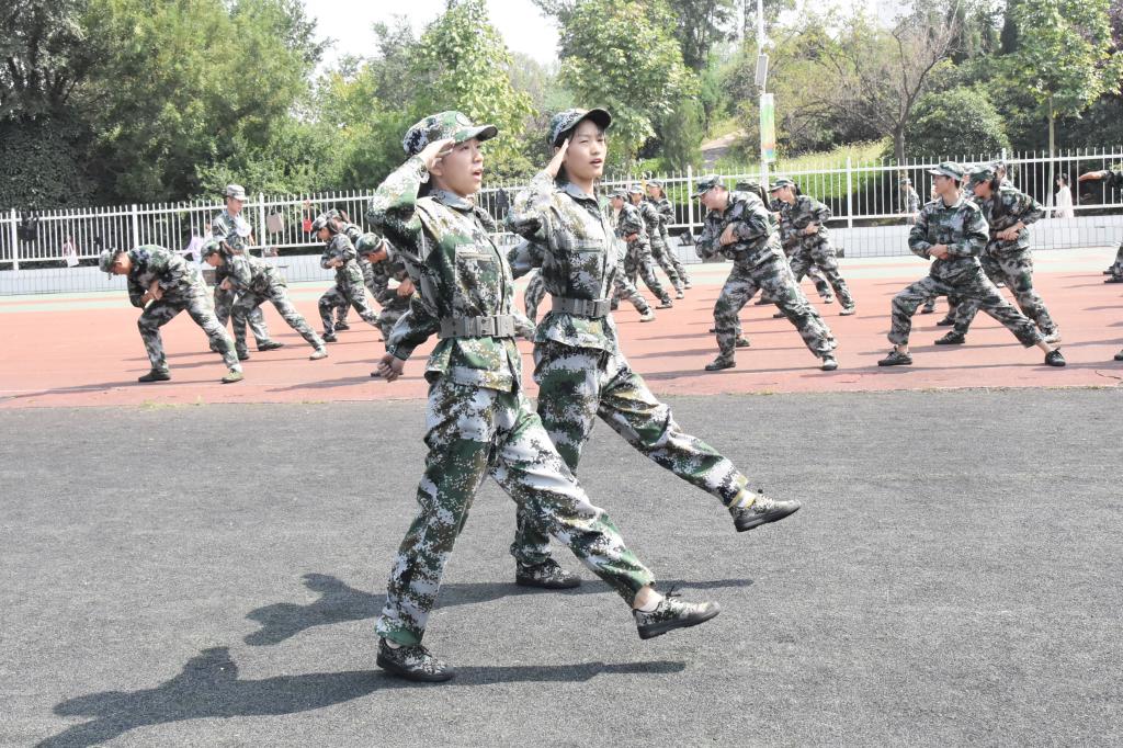 瞧,新同学们身着整齐的军装,从站军姿、稍息、立正、跨立等基本项目开始学起。每一个动作,教官都亲自分解示范与指导,从摆臂到踢腿,从握拳到绷脚,都要通过教官严格把关,长时间的站立让新生们感觉有些不适,但同学们仍然咬紧牙关坚持着,充分展现了我校学生自强不息的坚韧品质。