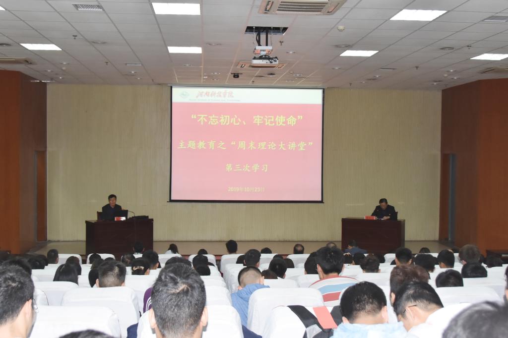 茹振钢教授情绪高昂地讲述了自己作为全国优秀共产党员代表参加庆祝新中国成立70周年庆典彩车巡游的情况,使大家身临其境地感受到庆典的喜庆热闹和恢弘大气,感叹祖国70年来的巨大发展成就和作为中国人的自豪感、骄傲感。随后他讲述了自己38年来,秉持 “育好品种为人民、搞好科研为国家”的理念,在培育小麦品种的过程中追求人生价值的故事。茹振钢教授爱岗敬业、刻苦钻研、无私奉献的精神品质感动了在座的每一位师生。他鼓励大家要踏实工作学习、用优异的成绩回报祖国、建设祖国。
