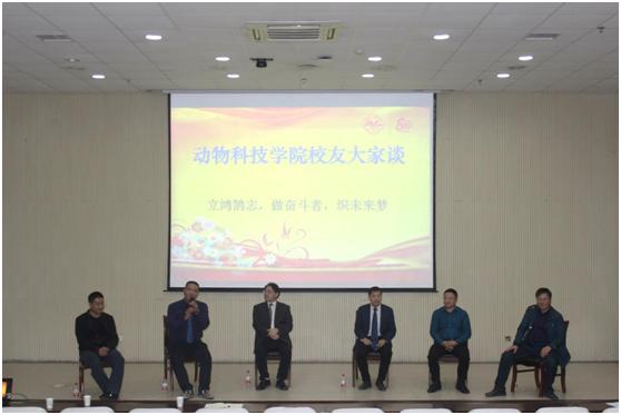 11月1日下午,动物科技学院在新图书馆一楼报告厅举行了“动科校友大家谈”活动。河南广安生物科技股份有限公司高天增董事长、中国科学院动物研究所何宏轩研究员、中国农业科学院农业基因组研究所左二伟研究员、延安大学基础医学院岳昌武教授、广东播恩集团李术勇总经理、郑州宠康伴侣动物医院有限公司卢旭院长,和学院师生代表300余人参加了座谈。