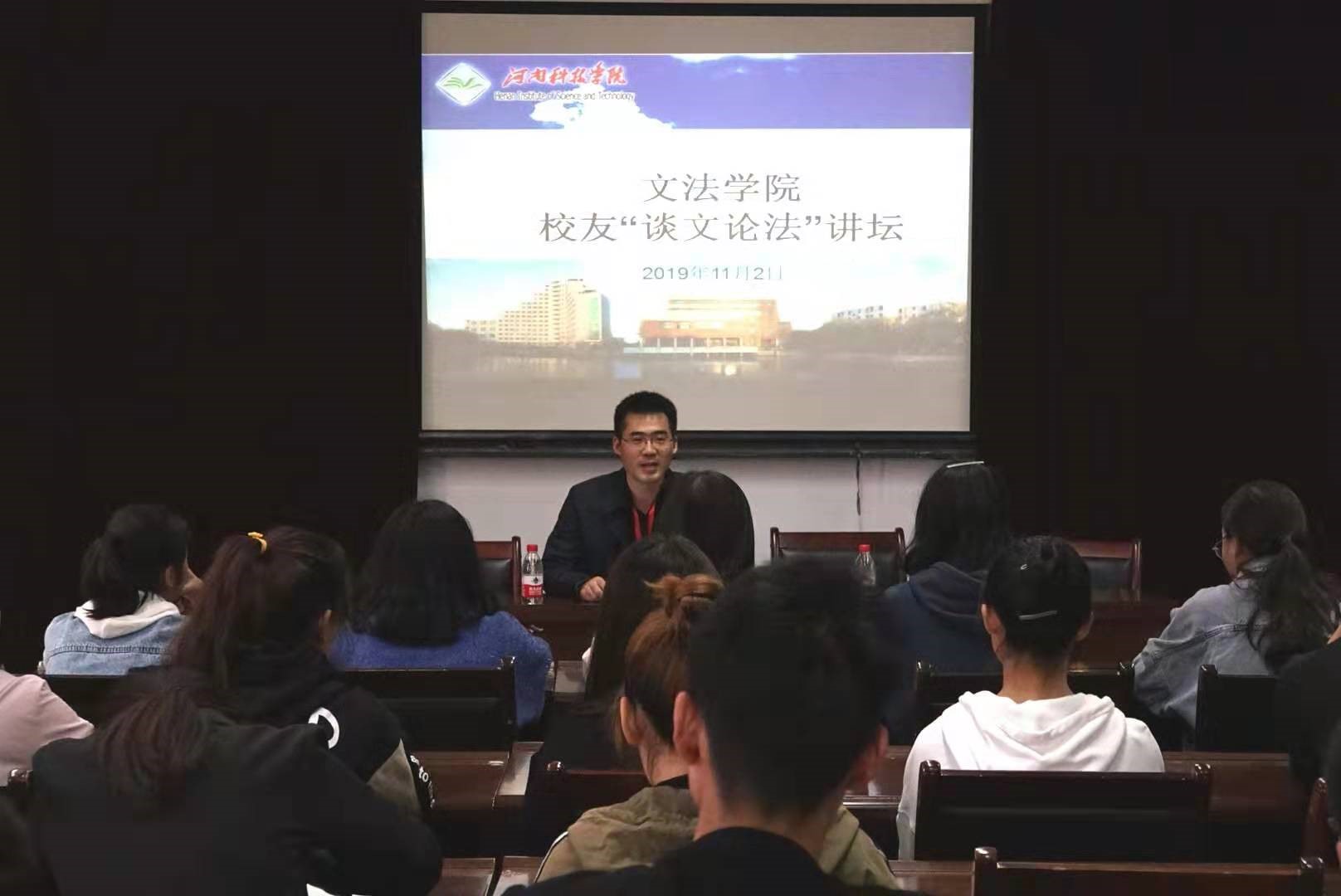 11月2日下午,文法学院分别在506学术报告厅和模拟法庭举办校友“谈文论法”讲坛,六位优秀校友应邀担任主讲人。他们结合自己的学习生活和工作经历,向在校学生分享了各自的学习经验和人生感悟,为在校学生指明了逐梦方向,增强了对专业知识和专业发展方向的认识,有利于树立正确的学习目标。