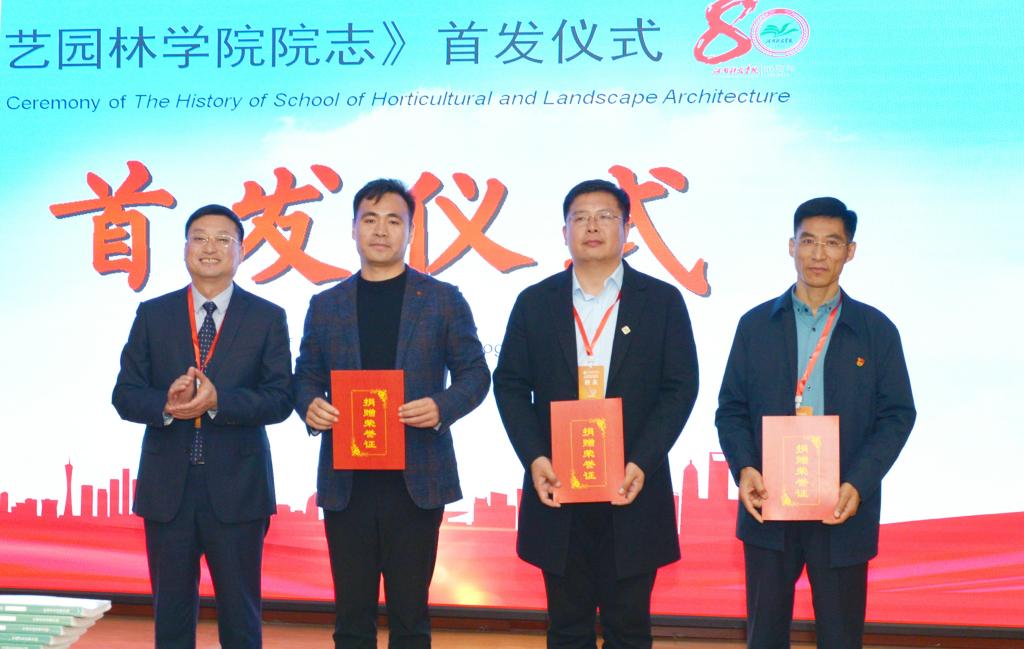 周志远、何松林、园艺园林学院党委书记郜庆炉为《园艺园林学院院志》启封。
