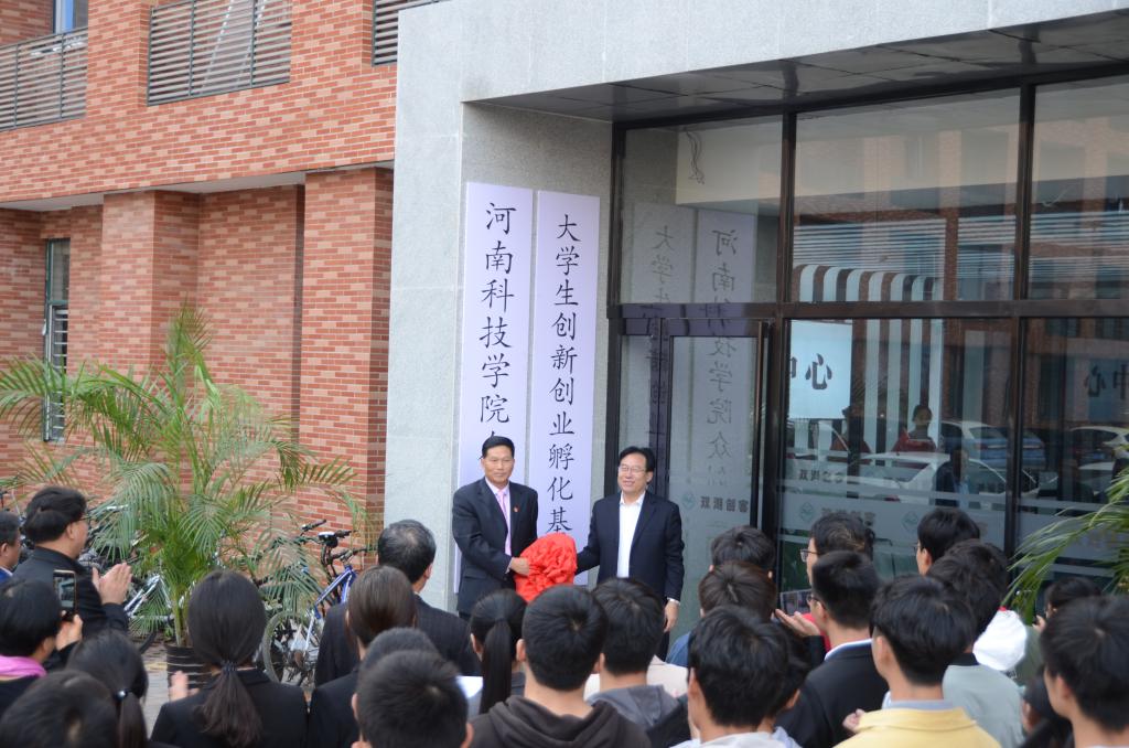 冯启高和王立奎共同为河南科技学院“双湖创客”众创空间和大学生创新创业孵化基地揭牌。