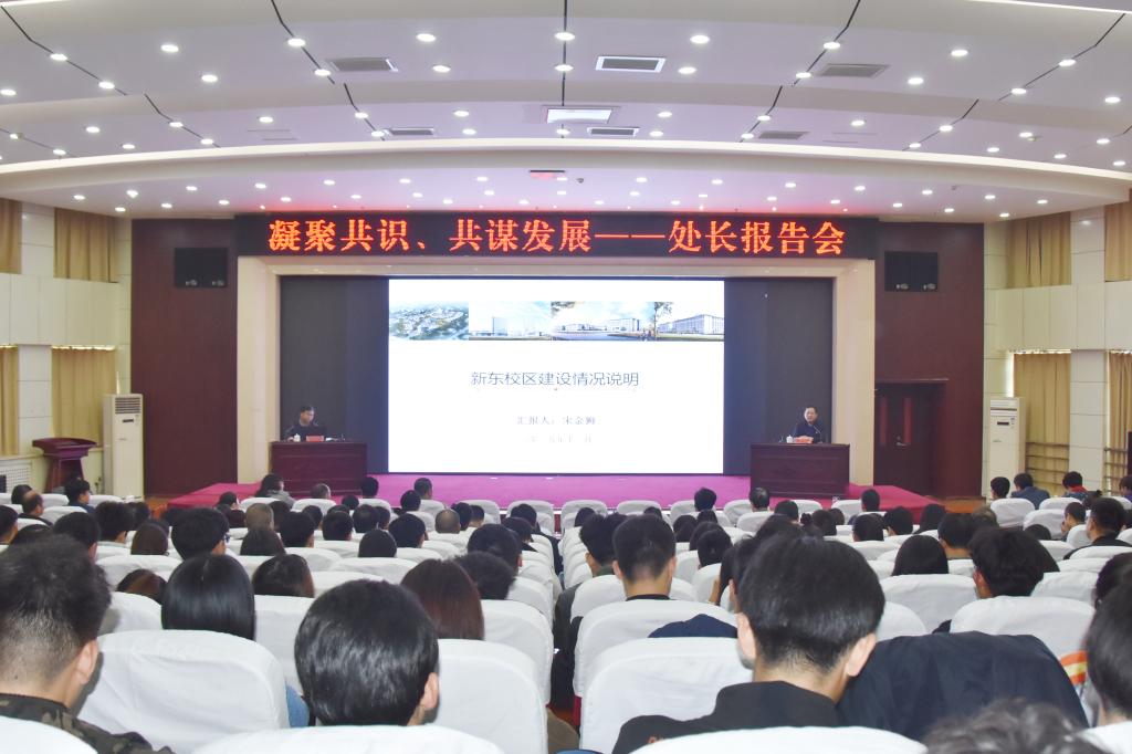 为落实“不忘初心、牢记使命”主题教育要求,凝聚共识、共谋发展,11月7日下午,第二期处长报告会在行政楼308报告厅举行,邀请基建处处长宋金狮就新东校区建设情况为师生答疑解惑。报告会由党委宣传部部长陈红卫主持。