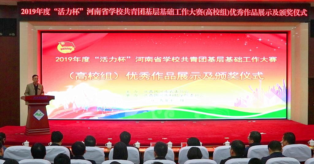 12月18日-19日,由共青团河南省委主办、我校承办的2019年度“活力杯”河南省学校共青团基层基础工作大赛(高校组)在行政楼308报告厅举行。共青团河南省委书记王艺、校党委副书记杨松璋出席优秀作品展示及颁奖仪式,团省委相关部门领导、全省各高校团委书记、获奖选手代表及我校师生代表共计300余人参加。