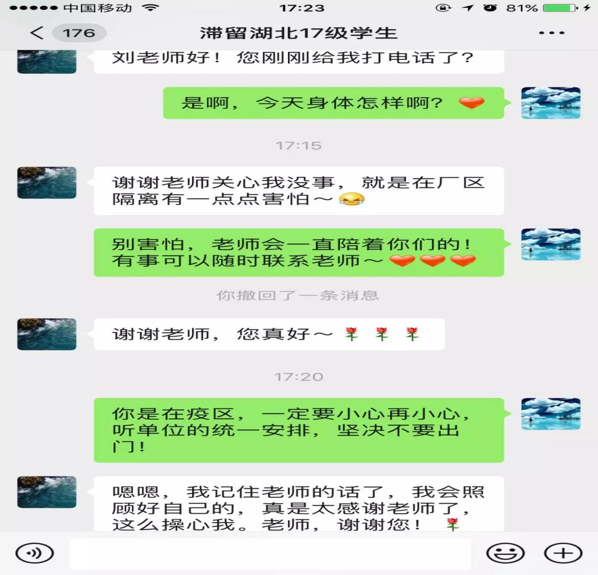 动物科技学院专门建立了一个针对因实习而滞留武汉的29名学生微信群,辅导员高莉每天呆在群里对学生进行心理疏导,帮助学生缓解负面情绪、克服恐惧,引导学生打开耳朵接受真实的信息,用积极态度面对学习和生活,用最佳状态和最好姿态坚定打赢抗击疫情阻击战的信心。“大家在湖北那边最近怎么样?你们单位的实习停了没?今天体温正常吗?在疫区那边要注意保护自己啊,有啥需要的跟我说,学校想办法帮大家解决困难”……有学生开玩笑,“高老师,您是机不离手啊,啥时候都在线哈”。