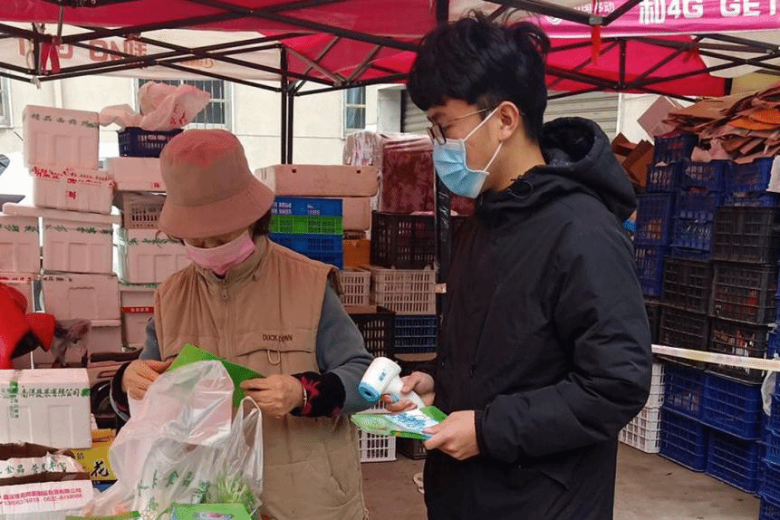 冀博龙在测量出入人员体温、宣传防疫知识