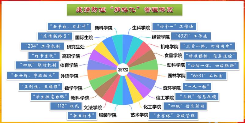 生命科技学院“四个一”工作法、经济与管理学院“4321”工作法、机电学院“三责一体、四网同步”、食品学院“精准化摸排、信息化追踪”、动物科技学院“四防一体化、四级联动机制”、园林园艺学院“6531”工作法、资源与环境学院“一人一档”、信息工程学院“三级”信息反馈机制、化学化工学院“四级”信息联动、艺术学院“金字塔”分层管理体系、服装学院“每日打卡”、文法学院“112”模式、教育科学学院“学生状态台账”、数学科学学院“五到位、五确保”、外国语学院“大数据分析、年级联点”、体育学院“四级”联防机制、高等职业技术学院“打卡系统”、新科学院“云平台、日打卡”、研究生工作部“234”工作机制、国际教育学院“疫情联络员”等有效措施,确保了学生信息排查精准实,坚决织牢织密学生疫情防控网。