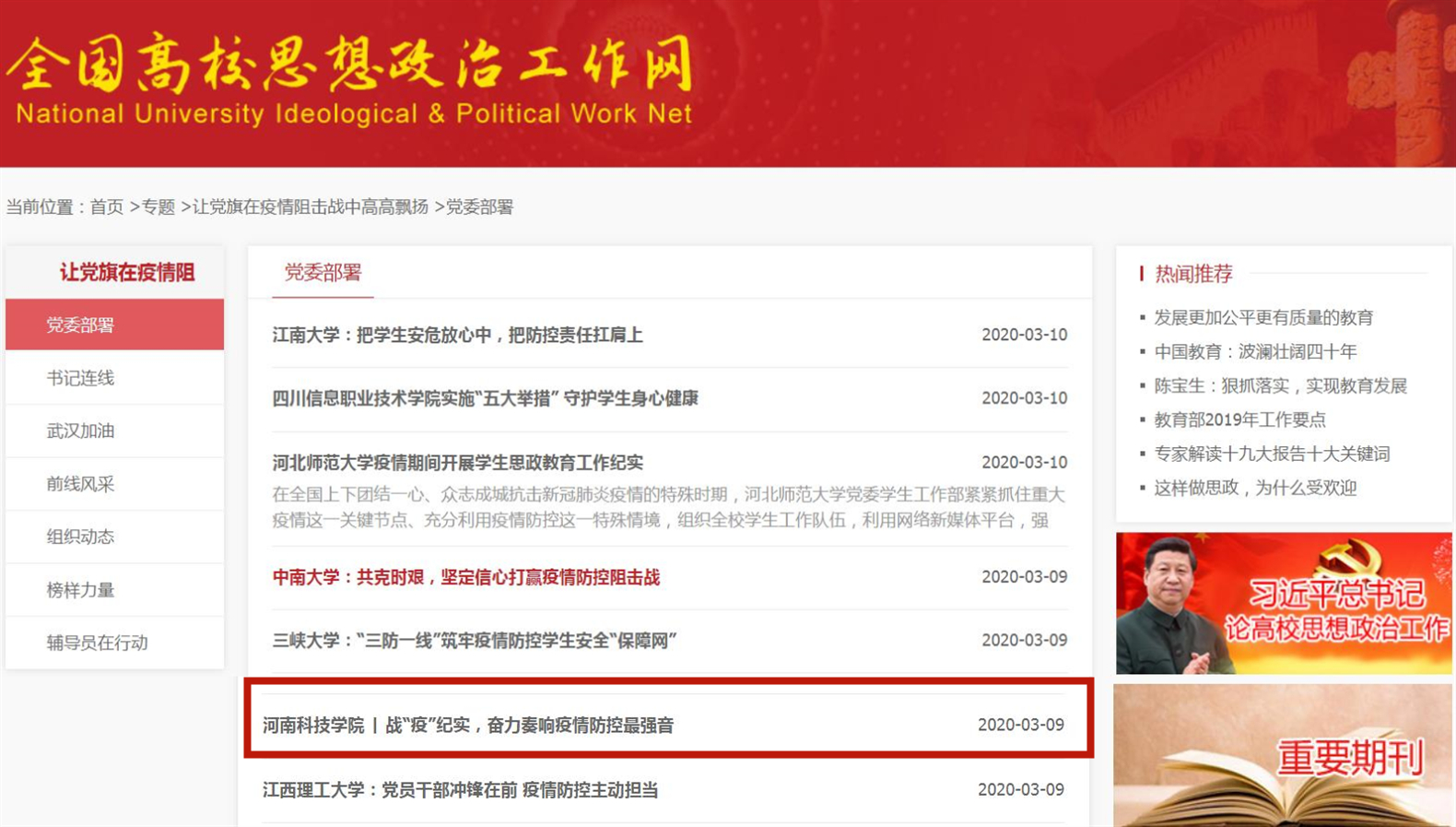 近日,全国高校思想政治工作网以“河南科技学院 | 战“疫”纪实,奋力奏响疫情防控最强音”为题,对我师生员工携手抗“疫”、共克时艰的情况进行了报道。