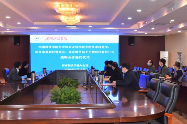 为充分发挥学校、院所、地方和企业的资源优势,进一步增强科技创新合力,打造政产学研用相结合的创新模式,促进科技成果转化和产业化,3月18日,河南科技学院、新乡高新区管委会、中国农业科学院生物技术研究所、北京博艾远上生物科技有限责任公司,举行四方携手合作“云签约”视频会议。