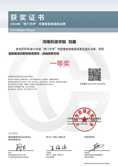 日前,2020年第十四届“西门子杯”中国智能制造挑战赛(线上)全国总决赛落下帷幕,我校机电学院大学生创新实验室刘鑫、郭德山、董忠孝3名同学以总分第六名的成绩,获得全国总决赛一等奖。