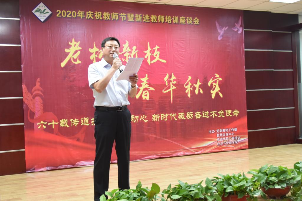 为庆祝第36个教师节的到来,使新进教师更好地适应教师职业角色,9月9日,由党委教师工作部、教师发展中心、离退休职工管理处、经济与管理学院主办的“老树新枝、春华秋实”新进教师主题座谈会在图书馆一楼报告厅举行。副校长何松林出席座谈会,党委教师工作部、教师发展中心、教务处、教学质量监控中心、离退休职工管理处、经济与管理学院相关负责人以及2020年51名新进教师参加活动。