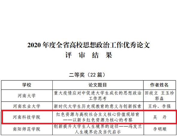 近日,中共河南省委高校工委、河南省教育厅下发《关于公布2020年度全省高校思想政治工作优秀论文评审结果的通知》。我校教师吴丹的论文《红色资源与高校社会主义核心价值观培育——以新乡红色资源为核心的考察》荣获二等奖。