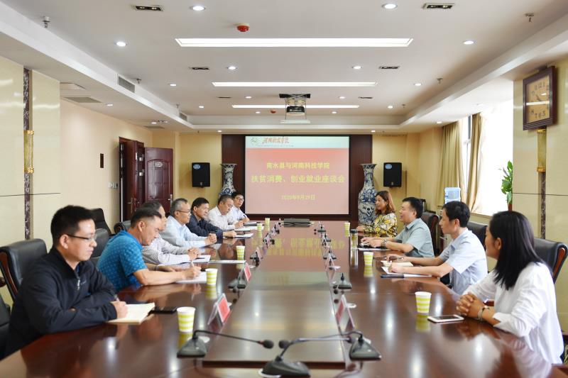 宋亚伟代表学校对耿协金一行的到来表示欢迎,介绍了我校与商水县结对帮扶取得的一些成效,就校地双方优势资源、发展需求、合作模式、实施路径等多方面的合作进行了交流,表示下一步学校将加强与商水县的沟通协调、提高工作效率、创新工作方式方法,并从扶贫消费、创业就业、产业引领、校友参与等方面对相关部门提出了新的要求。
