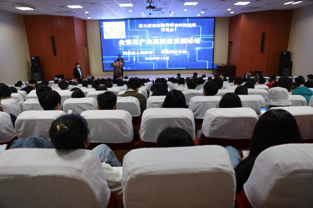 10月25日,由新乡市人民政府主办,河南科技学院、封丘县人民政府承办的第三届高博会“金银花产业高质量发展论坛”在我校图书馆报告厅举行。中国药科大学等单位的7位专家学者分别作了主题报告。新乡市政协副秘书长张文慧、我校副校长贾积身、封丘县常务副县长袁俊峰、封丘县副县长张生等出席会议。报告会由生命科技学院常景玲教授主持。封丘县科工信局及企业代表、我校生命科技学院师生代表共200余人聆听了报告。
