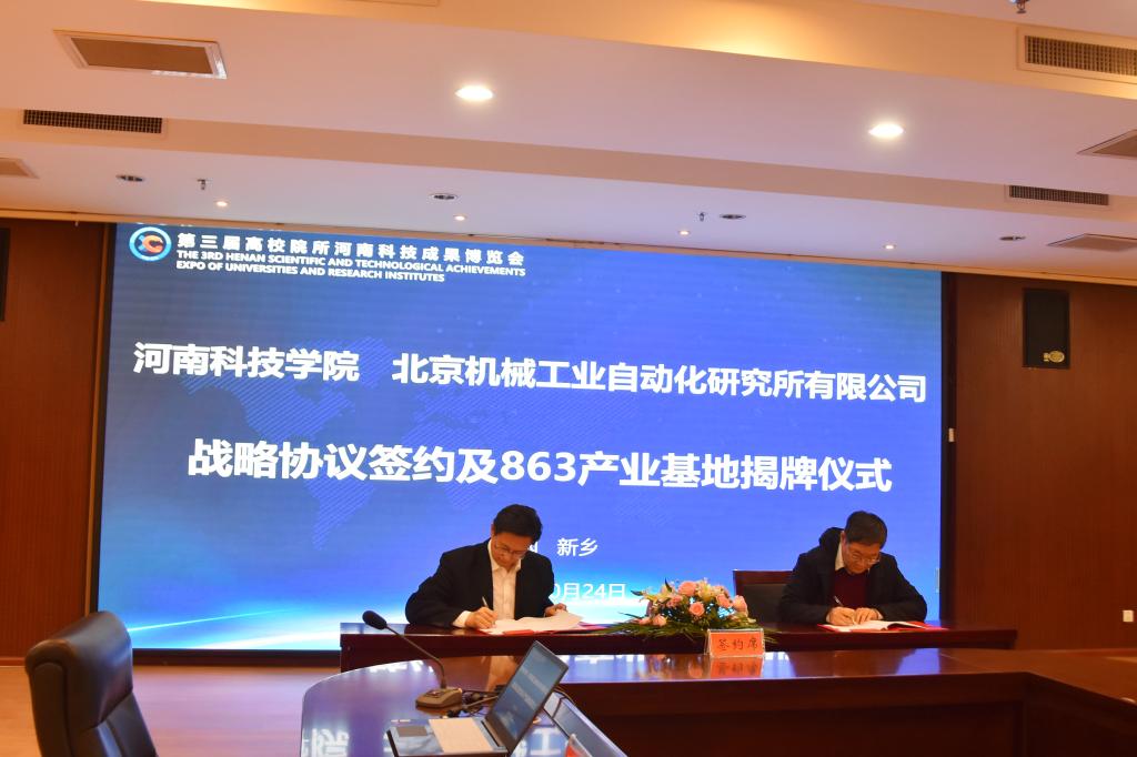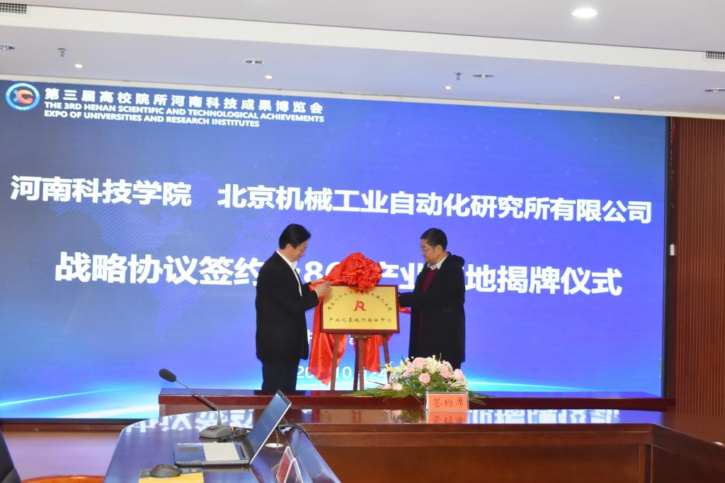 在热烈的掌声中,贾积身和刘波分别代表双方签署了校所战略合作协议,并共同为“国家八六三智能机器人主题产业化基地河南分中心”揭牌。