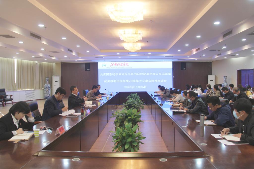 为进一步引导共青团系统师生深入学习、深刻领会习近平总书记在中国人民志愿军抗美援朝出国作战70周年大会上的重要讲话精神,10月26日下午,校团委在行政楼206会议室召开了共青团系统学习习近平总书记此次讲话精神座谈会。党委宣传部、党委学工部、校团委领导相关人员,各学院团委书记、校院两级“青年马克思主义者培养工程”培训班学员、团支部书记、学生干部代表80余人参加了座谈会。