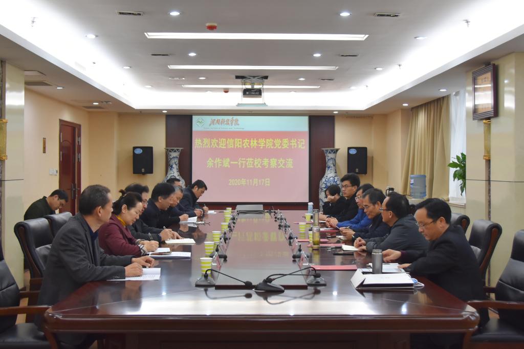 11月17日上午,信阳农林学院党委书记余作斌、党委副书记王庆兵、副校长赵一鹏等一行6人来校考察交流。我校在行政楼901会议室举行了座谈交流会。校领导周志远、宋亚伟、冯启高,党委办公室、发展规划处、巡察工作办公室、学生处等部门负责人参加会议。