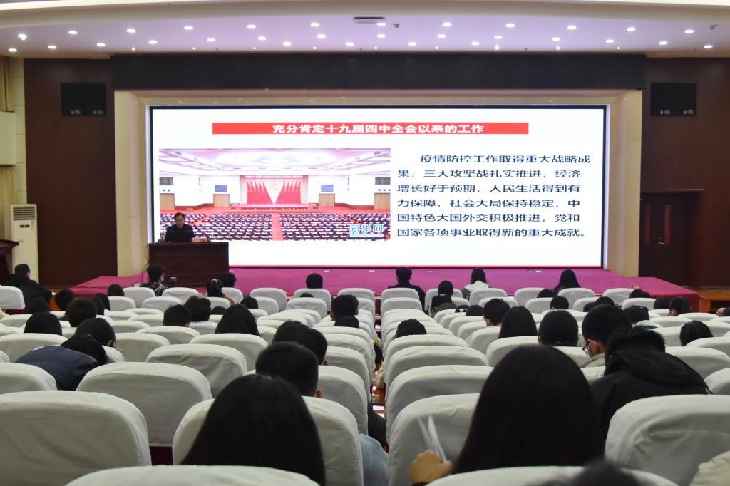 11月16日上午,副校长王霞在12号楼三楼合教以《奋斗“十四五”奋进新征程—深入学习贯彻党的十九届五中全会精神》为主题,为我校160余名新生讲授思政课。