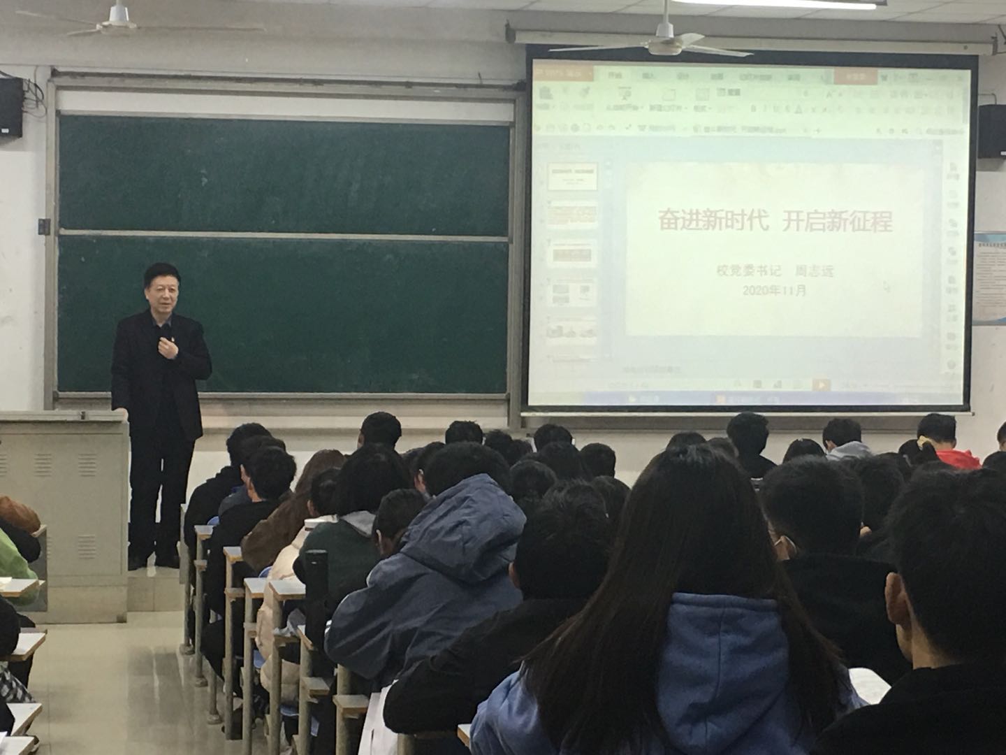 11月18日下午和11月19日上午,校党委书记周志远在12号教学楼合四教室,为360余名大一新生讲授《奋进新时代 开启新征程》主题思政课。