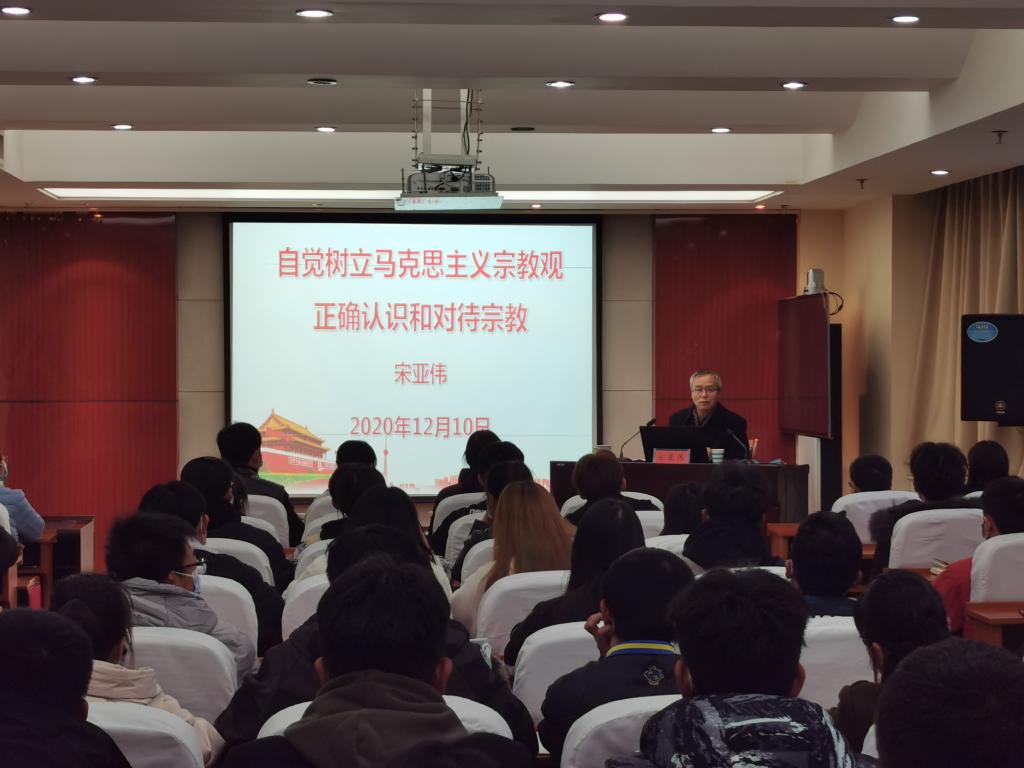 12月10日下午,校党委副书记、党委统战部部长宋亚伟以《自觉树立马克思主义宗教观,正确认识和对待宗教》为题,在行政楼701会议室向60余名2020级学生干部代表讲授思想政治理论课。
