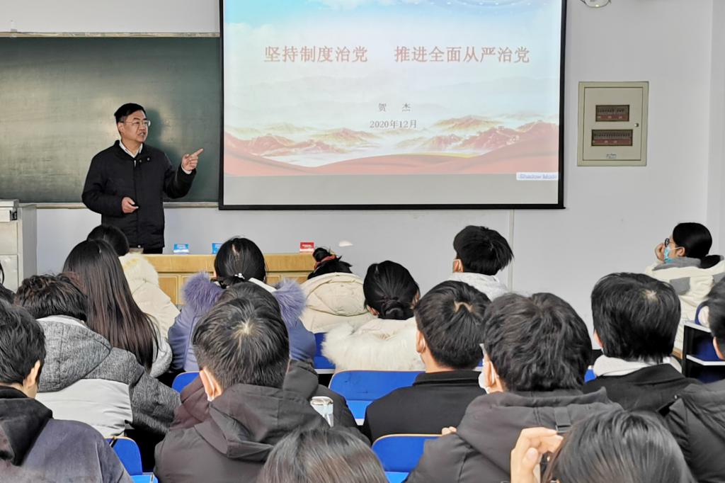 12月4日下午,校纪委书记贺杰在9号教学楼201教室,为资源与环境学院学生讲授《坚持制度治党,推进全面从严治党》主题思政课。