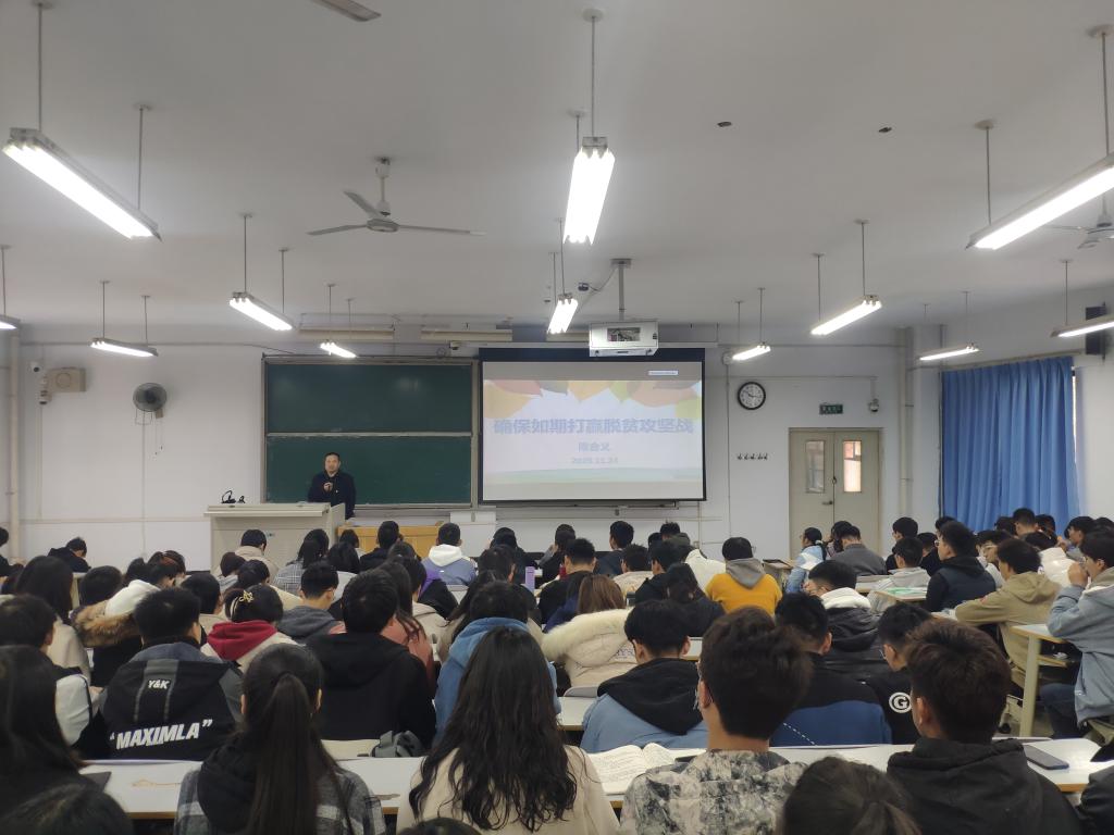 11月24日上午,副校长陈合义在9号教学楼合二教室,为180余名一年级大学生讲授《确保如期打赢脱贫攻坚战》主题思政课。