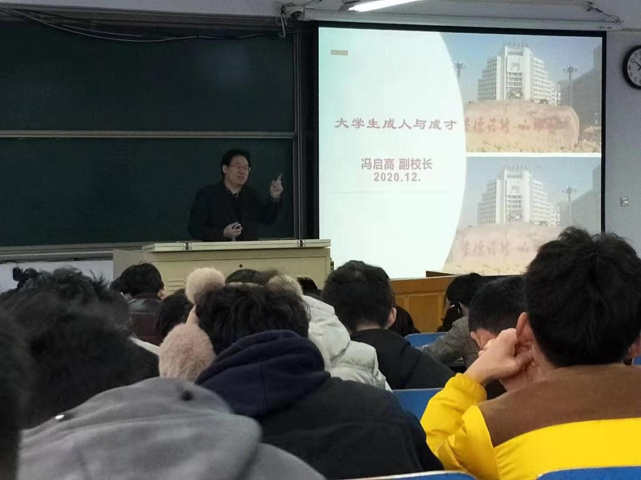 12月4日上午,副校长冯启高在5号教学楼合三教室,为210名信息工程学院大一新生讲授《大学生成人与成才》主题思政课。