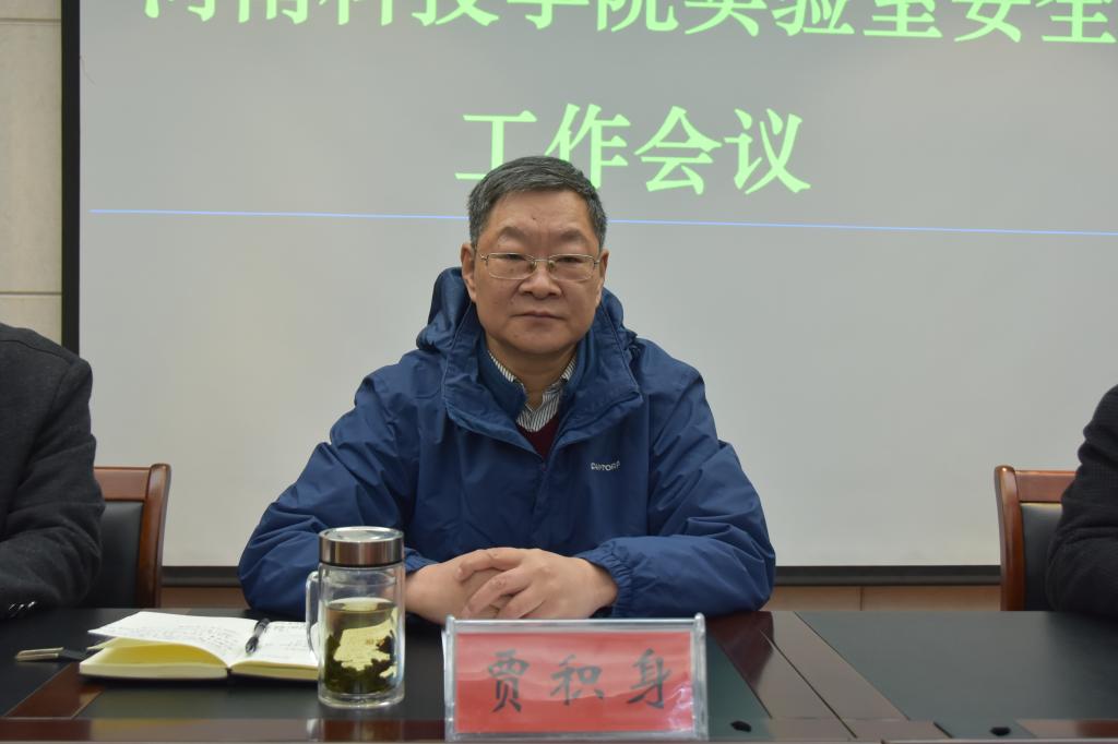 贾积身在讲话中就进一步做好我校实验室安全管理工作及迎接省教育厅专家对我校实验室安全工作调研,要求大家提高政治站位,牢固树立安全红线意识,认真贯彻落实党中央、国务院以及省委、省政府关于安全工作的重要指示精神,加强领导,消除隐患,防止各类安全事故的发生,确保师生生命健康财产安全;明确职责,全面提升实验室安全管理水平,严格按照“党政同责,一岗双责,齐抓共管,失职追责”的要求,构建由学校、二级单位、实验室组成的三级联动的实验室安全管理责任体系;迅速行动,在前期检查整改的基础上,进一步开展实验室危化品隐患排查治理。要加强危化品的安全管理,加强学生实验室安全教育与培训,确保学生掌握基本安全知识和技能;严肃认真对待此次调研,以高度负责、实事求是的态度精心组织,指派专人负责、主动对接,并积极配合、加强沟通,确保调研工作顺利进行。
