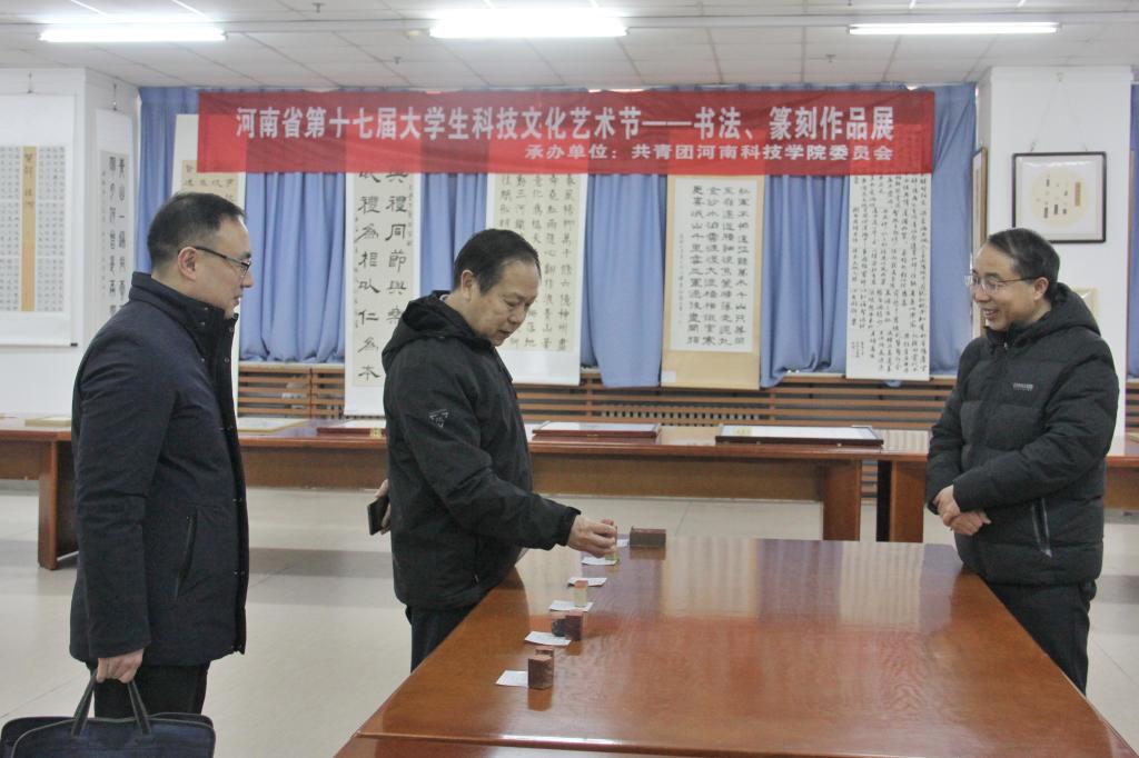 12月16日,由共青团河南省委主办、我校团委承办的河南省第十七届大学生科技文化艺术节校园书法、篆刻、摄影、美术作品大赛在图书馆二楼拉开帷幕。全省95所高校的840件作品参与评审展出。校党委副书记苗双虎亲临现场指导,党委学工部、校团委、艺术学院负责人陪同参观。