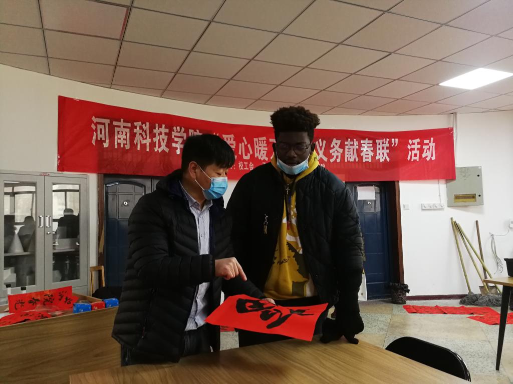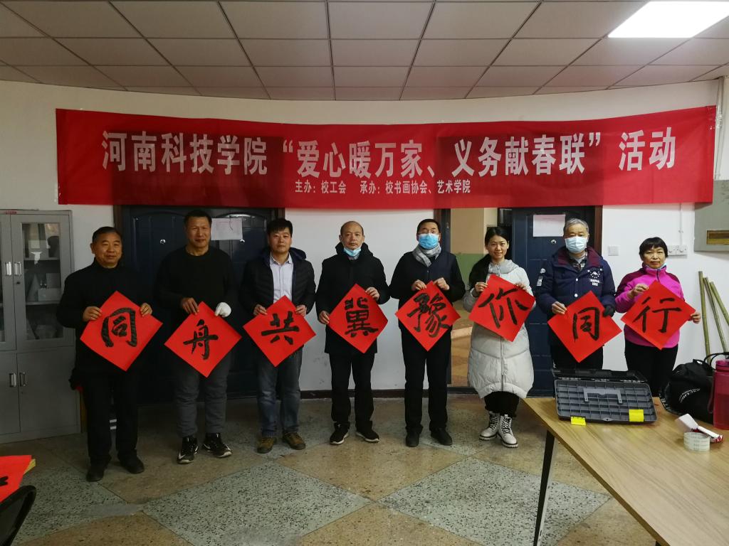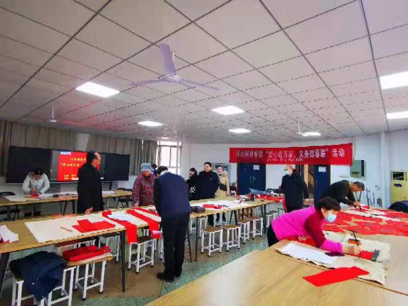 新冠病毒肆虐全球,我校的书法爱好者们拿起毛笔以艺抗疫,用笔墨尽情讴歌祖国大好河山、讴歌中国共产党英明领导下的伟大抗疫成果、讴歌中华人民的幸福生活。“书法家”们共同书写了“同舟共‘冀’、‘豫’你同行”,寓意河南河北人民一条心,在大家共同努力下,河北石家庄等地人民一定能克服时艰、尽快战胜新冠肺炎疫情。领到春联的教工们赞不绝口。为了能给更多的需求者写好春联,协会成员们顾不上天气的寒冷和身体的疲惫,连续书写了近四个小时,为教职工送去春联200多幅。