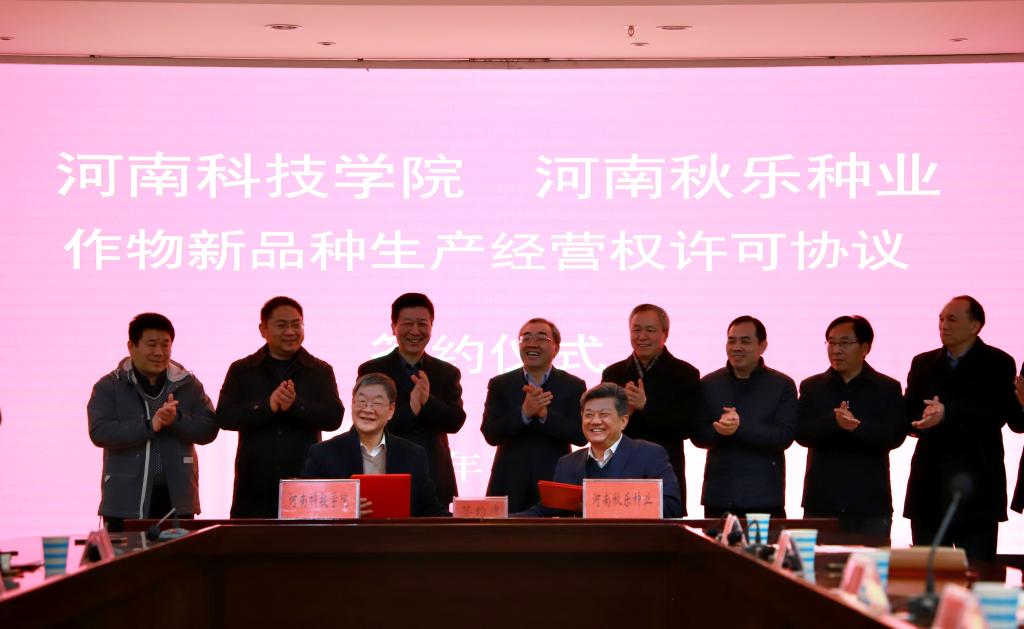 2019年,学校与河南秋乐种业科技股份有限公司签订战略合作协议,为双方的合作建立了桥梁和纽带,实现了双方的优势互补、强强联合。今天签订的转化协议,为双方的合作奠定了新的基础。今后,双方将继续携手并进,充分发挥彼此优势,展开更为深入、更加多元的合作,推出更多优质高效多抗的作物新品种,为加快现代种业强省建设,保障国家粮食安全做出新的更大的贡献。