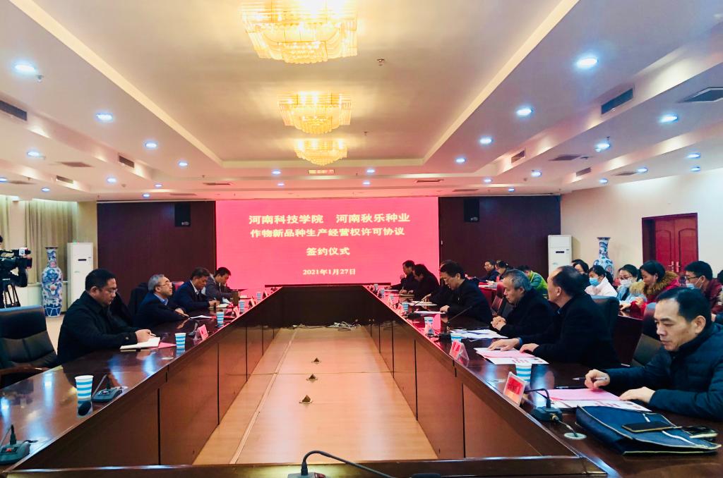 1月27日下午,我校与河南秋乐种业科技股份有限公司作物新品种百农307、百玉9337转化协议签约仪式在行政楼206会议室举行。中国工程院院士、河南省农业科学院院长、河南秋乐种业科技股份有限公司董事长张新友,我校党委书记周志远、党委副书记宋亚伟、副校长贾积身出席签约仪式,河南秋乐种业科技股份有限公司总经理、副总经理,我校科技处、生命科技学院负责人以及育种团队成员参加了会议。