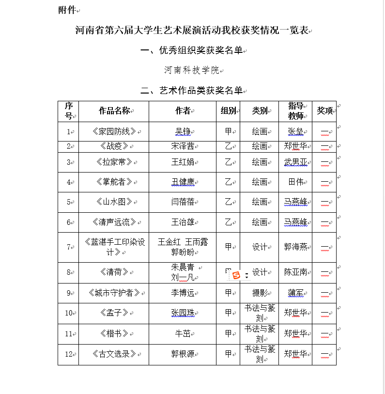近日,河南省第六届大学生艺术展演活动落下帷幕。我校选送的作品共获奖项42项,其中一等奖15项、二等奖18项、三等奖6项、校长风采奖3项。我校获得优秀组织奖。