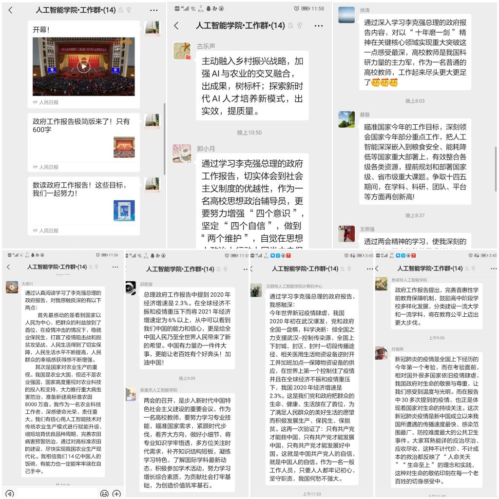 第十三届全国人民代表大会第四次会议和中国人民政治协商会议第十三四届全国委员会第四次会议,分别于3月4日和3月5日开幕。人工智能学院师生通过电视、广播、报纸、网络等媒介热切关注“两会”动态,主动学习“两会”精神,并通过微信群等积极发表学习感言。大家结合自身学习、生活和工作实际,热议“两会”精神,为全国“两会”点赞。