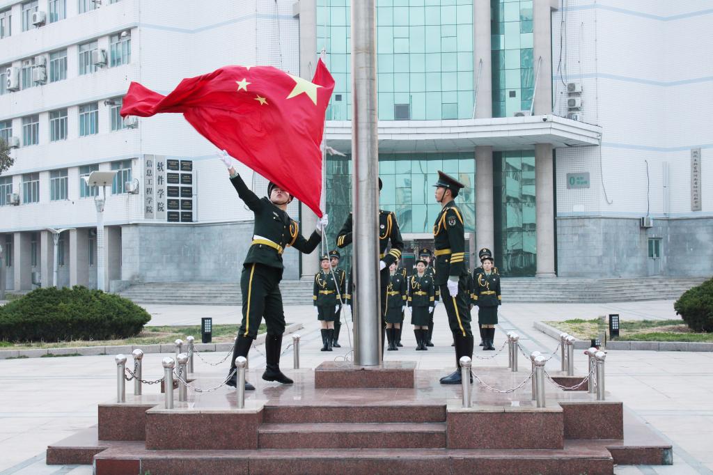 七点整,我校国旗护卫队队员迈着整齐的步伐,护送着鲜艳的五星红旗走向升旗台。擎旗手走上前,将国旗交给展旗手。国歌奏起,展旗手将五星红旗抛向天空,全体队员向国旗行军礼,迎着清晨的第一抹朝阳,五星红旗冉冉升起。