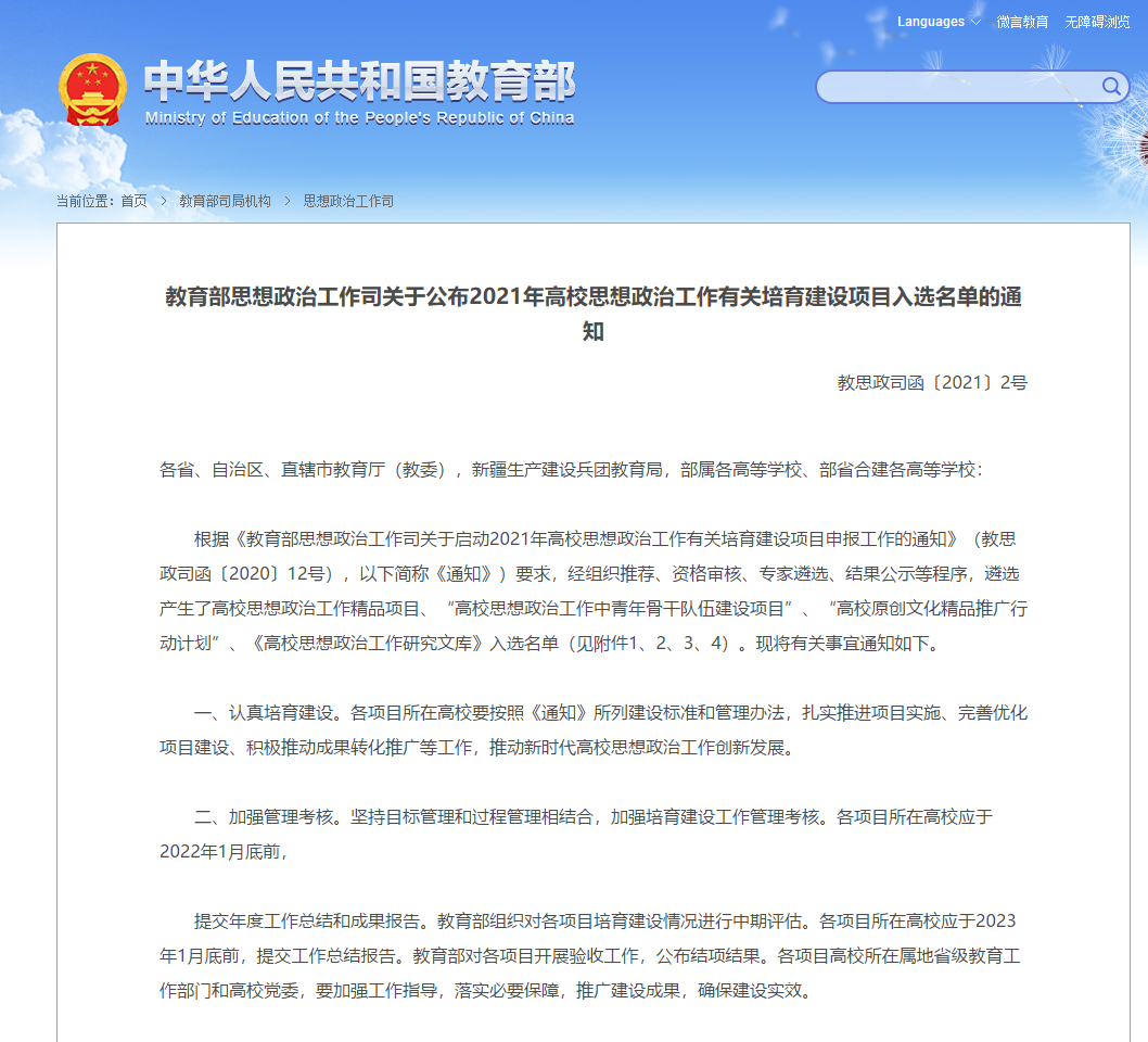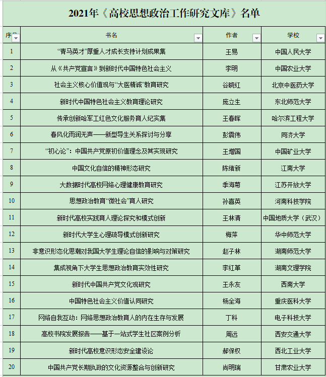 近日,教育部发布了《关于2021年度高校思想政治工作有关培育建设项目入选名单的通知》。我校马克思主义学院教授孙喜英主持的《思想政治教育“微社会”育人研究》,经组织推荐、资格审核、专家遴选、立项公示等程序,成功入围“高校思想政治工作研究文库”项目,成为全国20个高校思想政治工作研究文库项目之一。该项目经费教育部将直接划拨人民出版社,并由其负责成果的出版。